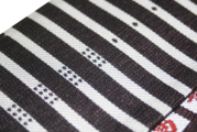 一万点棒、五千点棒、千点棒、百点棒。麻雀に欠かせない点棒を、ストライプとドットの幾何学模様として再構築しました。白と濃茶のコントラストが美しく、どんな着物にも合わせやすい都会的な表情に仕上げています。