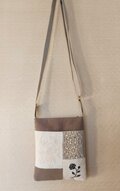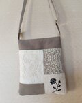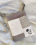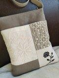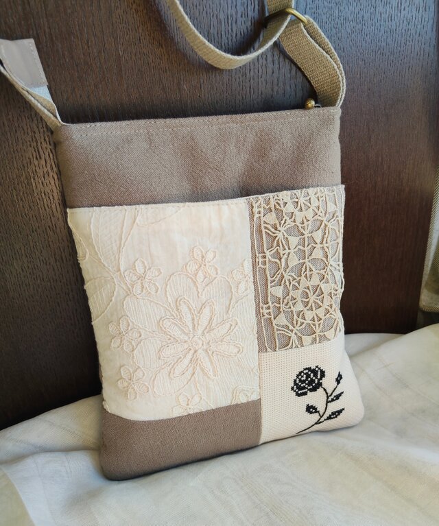 マッシュルームブラウンのコットンリネンに上質な刺繍生地、アンティークレース、薔薇のクロスステッチを組みわあせたショルダーバッグです。