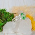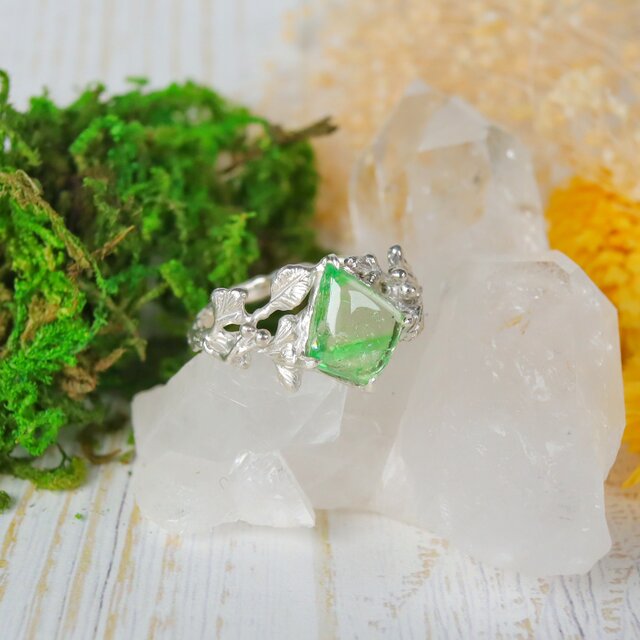 鮮やかなグリーンと透明の部分、二種類の色を楽しめるガーネットを植物デザインの指輪に仕立てました。