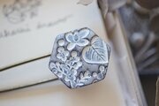 草花をモチーフに消しゴムはんこを彫り、はんこを陶土に捺しつけて凹凸の模様をつけたストールピンタイプのブローチです。