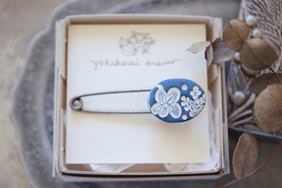 草花をモチーフに消しゴムはんこを彫り、はんこを陶土に捺しつけて凹凸の模様をつけたストールピンタイプのブローチです。
