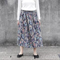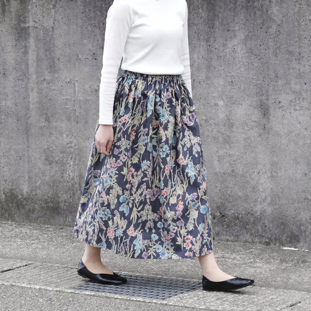 上質・綿麻生地 水彩画風 ボタニカル・ガーデン ギャザースカート(ネイビー)リネン 麻 ロング マキシ ポケット