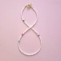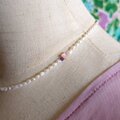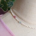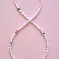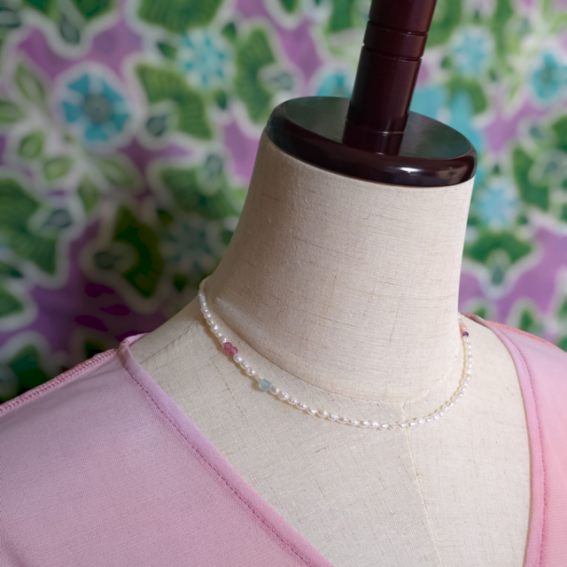 小さめの淡水パールをぐるりと一周分使用し、アクセントにはカラフルで表情豊かな天然石たちを散りばめました。