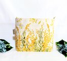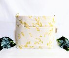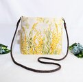 落ち着いた色合いの生成り色(ベージュ色に近い色合いです)に、風に舞う可愛いミモザの花柄薄手綿シーチング地のモーメント( mOmen-t)地を使用しています。