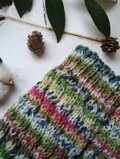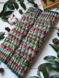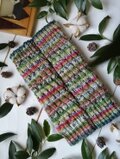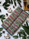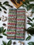 緑の野原に咲く花のような色合いの毛糸を、スパイラル編みのレッグウォーマーに編み上げました。