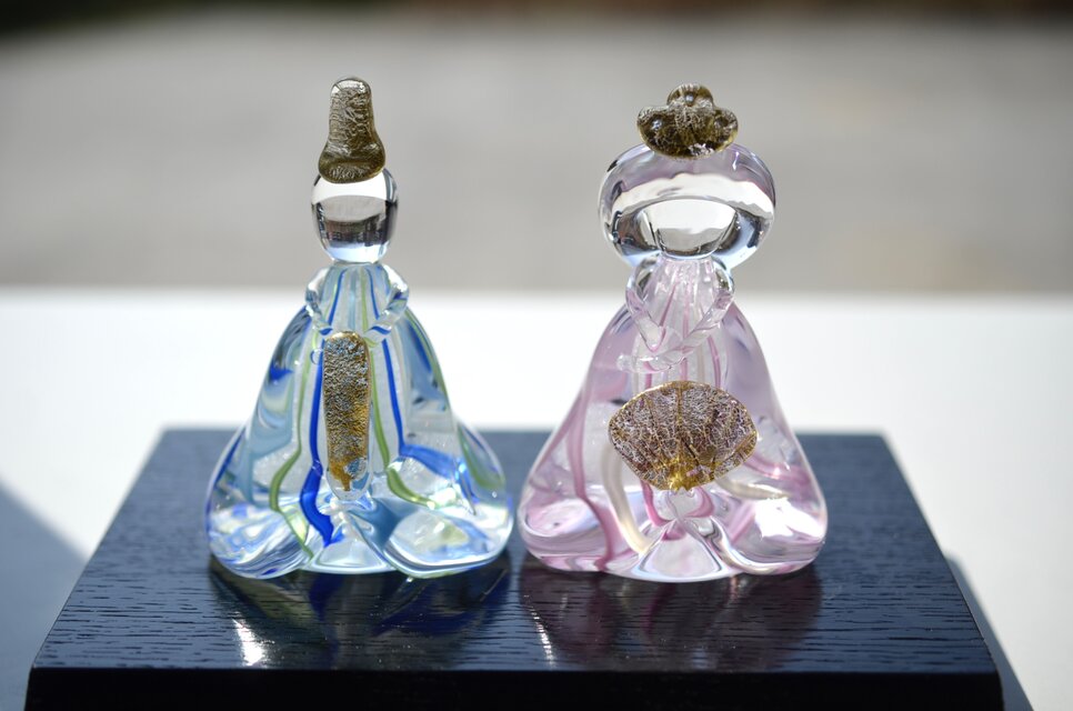 白い泡のガラスに色ガラスのお着物をきせて、親王雛を表現しています。