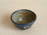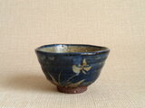 この作品は、粗めの信楽の土を使いろくろで成形した湯のみに液体ゴムですみれを描き、上から釉薬をかけて焼成を重ねて仕上げています。液体ゴムをはがすことで、柔らかな抜絵の表情が生まれています。粗めの土を使用しているため、表面には黒点が多く見られます。これは陶土に含まれている鉄分が窯の中で焼かれて酸化し、自然に現れたものです。高台周りはヘラで削り、表情のある模様を入れています。