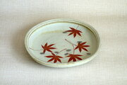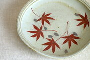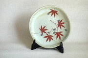 この作品は、信楽の土を用いてろくろで作った四方皿に、紅葉と桜の花びらを手描きで丁寧に少しづつ加彩し焼成を重ねています。緩やかな四方に形成しヘラ目を周りに入れて味わいを出しています。高台も丁寧に仕上げています。銀を使っての絵付けは技術的に難しく、作業時の温度・湿度管理に気を遣い制作しています。