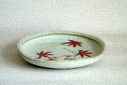 陶房の庭の紅葉と桜の花びらを華やかに描いた、落ち着いた色と質感の四方皿です。