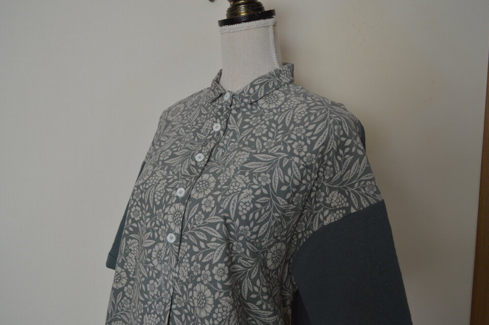 小さめ仕立ての衿がポイントのバイカラー五分袖シャツです。