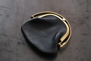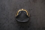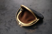 左右両側から挟み込むと、ワンタッチで開く口金。東京下町の小さな町工場で、オリジナルで作っています。見た目も素敵ですが、ワンタッチで開く使い勝手と心地良さがあります。細かなバネパーツもあり一見繊細そうに見えますが、店主は3年以上使っていて、緩みもなく日常使いで活躍し続けています。口金も、革と一緒に経年変化を重ねます。