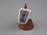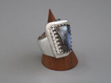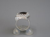 リングのサイズは12.5号、重さは20g、最大幅は27mm、手のひら側の幅は7mm、金属部分は純銀です。