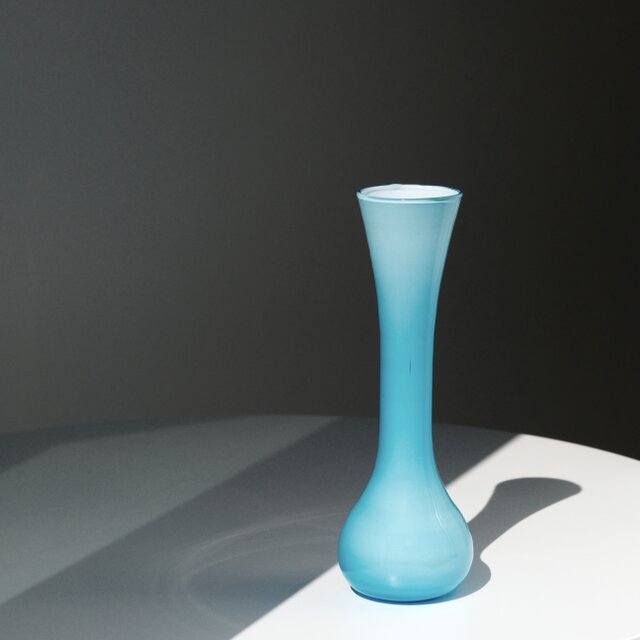 フランスで買い付けた、オパリンガラスのフラワーベース。乳白を含んだ柔らかなターコイズブルー。すっと伸びるネックから丸みのあるボトムへと続く、ミニマルで美しいシルエットです。19世紀フランスで広まったオパリンガラス特有の、やわらかな発色と奥行きは置くだけで空間に余白と品を添えてくれます。一輪挿しとしてはもちろん、枝ものやドライとも好相性。オブジェのようにそのまま飾るのもおすすめです。