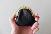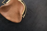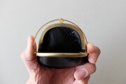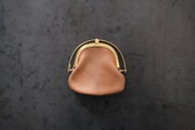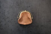 左右両側から挟み込むと、ワンタッチで開く口金。東京下町の小さな町工場で、オリジナルで作っています。見た目も素敵ですが、ワンタッチで開く使い勝手と心地良さがあります。細かなバネパーツもあり一見繊細そうに見えますが、店主は3年以上使っていて、緩みもなく日常使いで活躍し続けています。口金も、革と一緒に経年変化を重ねます。