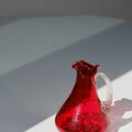 深いルビーレッドに、手仕事ならではの揺らぎあるフォルムが可愛らしい一点です。なだらかなラインとクリアハンドルのコントラストも美しく、一輪挿しとしてはもちろん、オブジェとして飾るだけでも絵になる佇まいです。背の高い花器で役目を終えた花を、茎を整えて移し替えるセカンドベースとしても重宝します。
