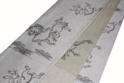 銀の輝きを湛えた織り地に、捺染技法によって鳥獣戯画の世界を鮮明に再現しました。カエルやウサギたちが生き生きと遊ぶ姿は、見る人の心を和ませ、装いに小粋な遊び心を添えてくれます。