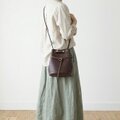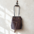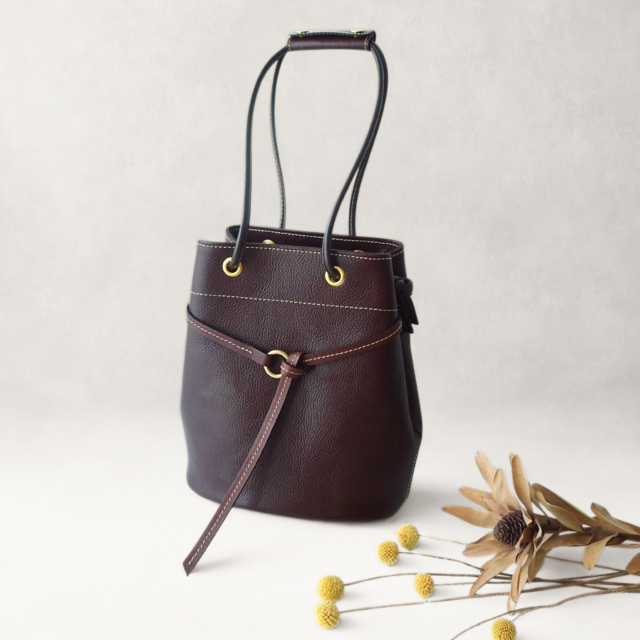 気軽に持てるきんちゃく型に、真鍮のリングと長く垂れるベルトのディテールを効かせました。
