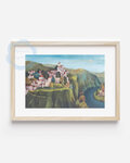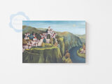 お城のある川沿いの町の風景を水彩絵の具で描きました