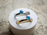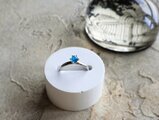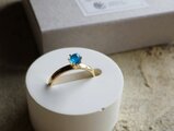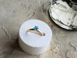 ネオンブルーアパタイトは透明感が高く突き抜けるような青色は、まさに太陽の光きらめく海の波のしずくのように、瑞々しく艶やかで見る人の心を潤すようです。透明度が高く、鮮やかな発色が魅力。石の硬度が低いため、石が欠けやすい上に透明感が高い分、石の内傷や内包物もはっきりみえています。自然界の石らしい表情を楽しめる指輪です。