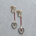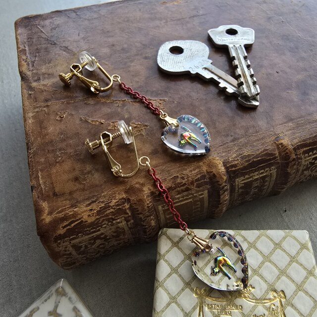 透明なハート型のヴィンテージガラスに、ちいさな猫のモチーフを閉じ込めたイヤリング。