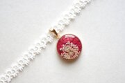 光沢のあるルビーレッドに白いレースフラワーをあしらった、華やかで大人っぽいレジンを、サテンリボンにタティングレースで装飾を施したチョーカーに仕上げました。
