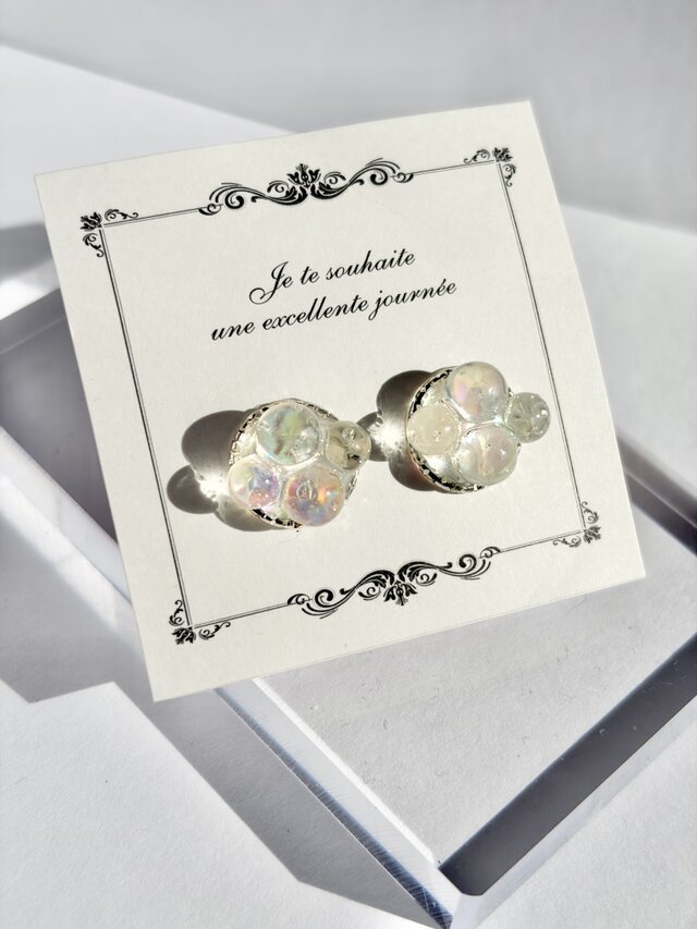 キラキラと透明感がつまった作品です♡ 光の当たり具合で見え方が違ってずっと見ていたい様なそんなキレイさがあります。 ピアスにもイヤリングにも♡