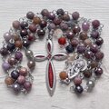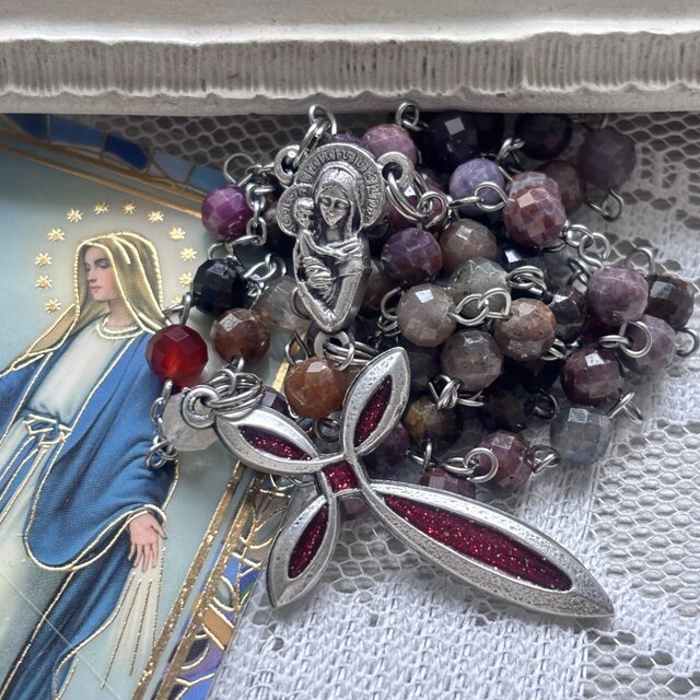 こちらのロザリオはマルチカラーサファイアでルビーの赤の他、ピンクコランダム、オレンジコランダムなど赤茶系が多いです。