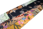 両面すべてに更紗生地を使用し、さらにその裂(きれ)を「切嵌(キリバミ)」の手法でパッチワークのように繋ぎ合わせた、圧倒的な情報量と物語性を持つ創作帯です。