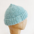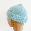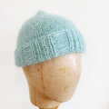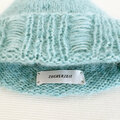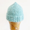 爽やかなアクア色のニット帽です。糸芯が白色でその周りにアクア色の糸があり、色の変化が面白い糸です。糸の特徴を生かすため、折り返しの部分が梯子のように糸が渡っているデザインで作りました。フワフワとしていて、軽やかな印象です。