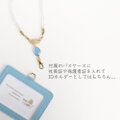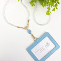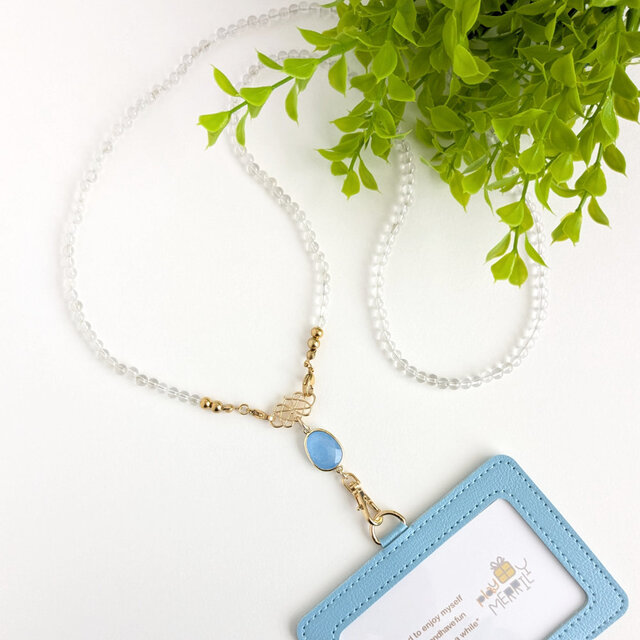 トップに煌めくアクアマリンのフレームストーンが可憐な天然水晶のネックスストラップに、スカイブルーのパスケースを組み合わせた、IDカードホルダーです。