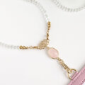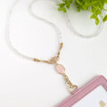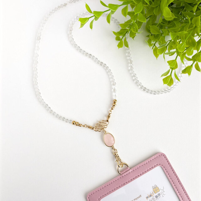 トップに煌めくローズクォーツのフレームストーンが可憐な天然水晶のネックスストラップに、サクラピンクのパスケースを組み合わせた、IDカードホルダーです。
