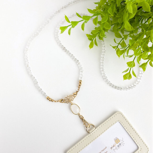 トップに煌めく水晶のフレームストーンが可憐な天然水晶のネックスストラップに、アイボリーのパスケースを組み合わせた、IDカードホルダーです。