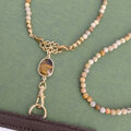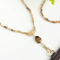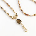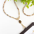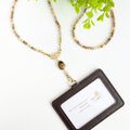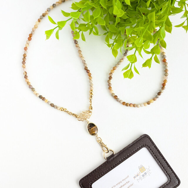 トップに煌めくタイガーアイのフレームストーンがエキゾチックなフォシルコーラルのネックスストラップに、ブラウンのパスケースを組み合わせた、IDカードホルダーです。