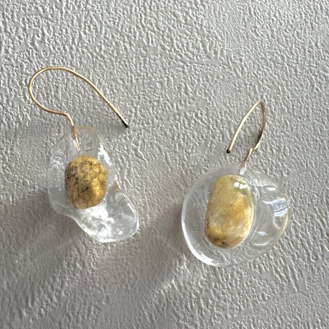 ベージュの石の美しさを、透明の石の中に閉じ込めたら素敵かもしれない。と考えて製作したレジンのピアス。オリジナルのモールドから作成することで、イメージ通りに実現しました。まるでアートみたいなデザインです。