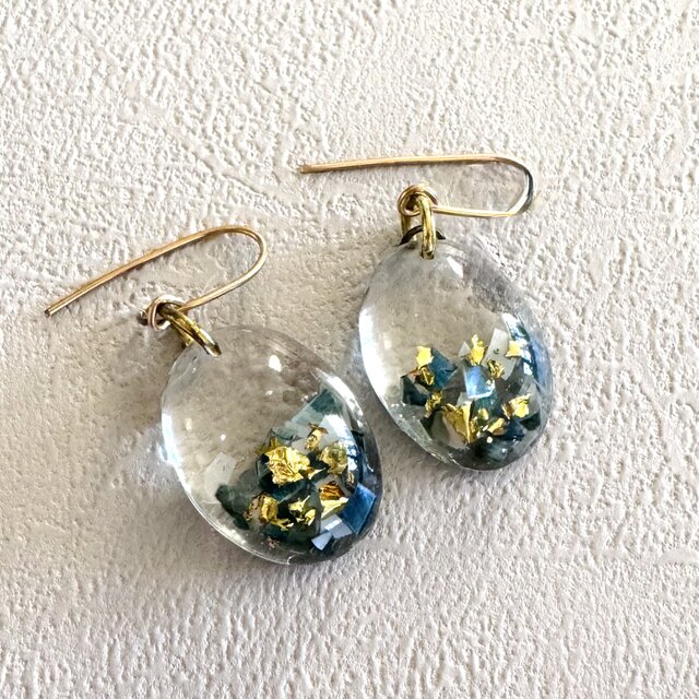 ブルー系ラメとゴールドラメのレジンピアス。透明感を演出しつつアンティーク風にデザインしました。
