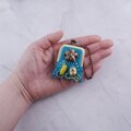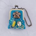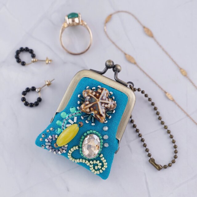 小さなビーズ刺繍のがま口 No.96|セルリアンブルー×ガーゼ|ネックレス・バッグチャームにも|アクセサリーケース