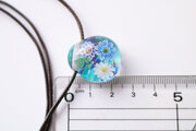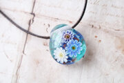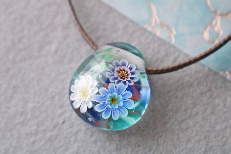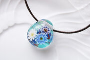 水色×青の地に、白・青・青紫のガーベラを咲かせたガラスペンダントです。