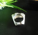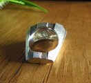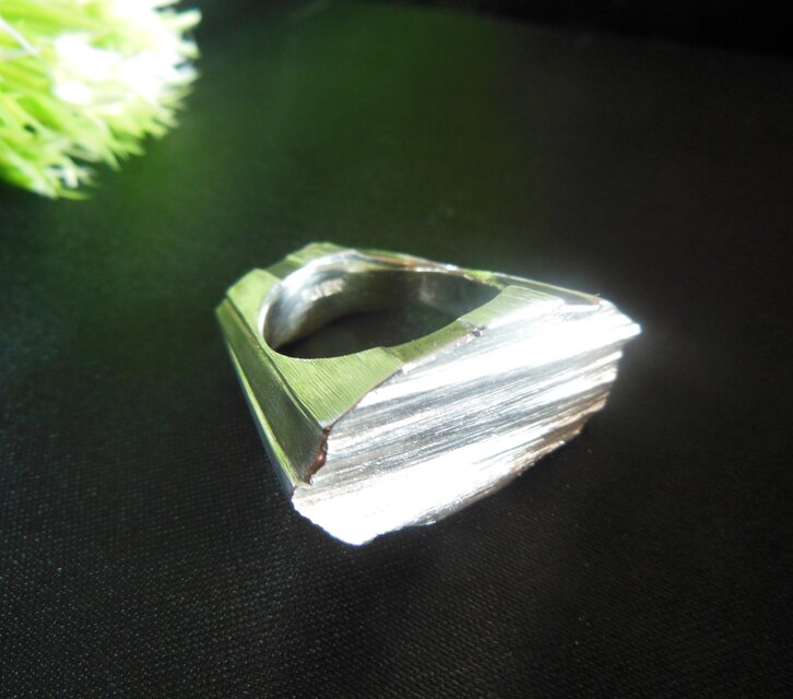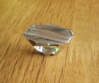 シルバーに四分一のストライプを入れたリングです。トップは糸鋸の切断面の面白さをそのまま生かし、側面は切り込みを入れ、そこに四分一をはめ込みました。四分一は銀と銅の合金でグレーの渋みのある色になります。