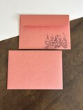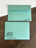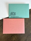 クラフト紙のような渋い色味(スカーレット、ターコイズ)の紙に、シンプルなモノクロ印刷でポストカードも入る洋2サイズの封筒です。
