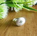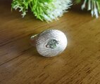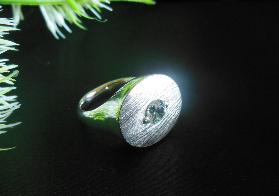無色の天然ジルコンのリングです。ほぼ透明ですが、ほんのわずか青みがかって見えます。トップには鏨による手彫りのテクスチャーをつけてあります。