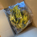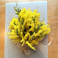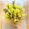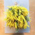 その日に摘んだミモザの枝をスワッグに整え、段ボール80サイズにお詰めして、お送りいたします。長さ38cmくらいになります。お箱のサイズ 39 X 29 X 高さ8.8cm