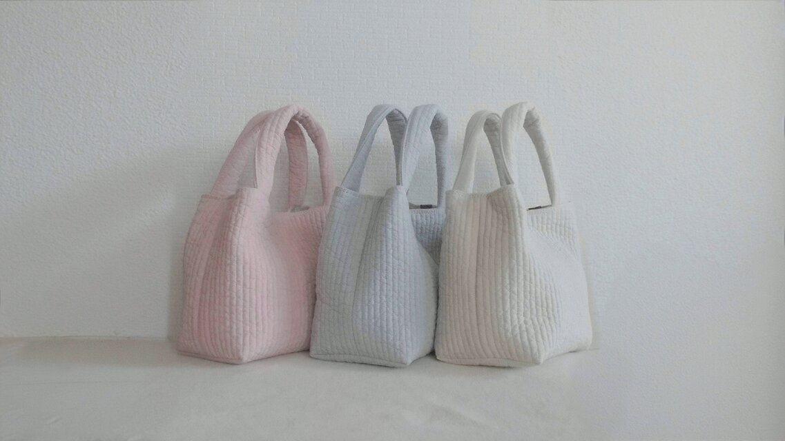 7mm幅の淡く優しい色合いの3カラーの韓国のヌビ生地(ラインキルティング)を使用した、軽くて使いやすいシンプルな小さめトートバッグです。