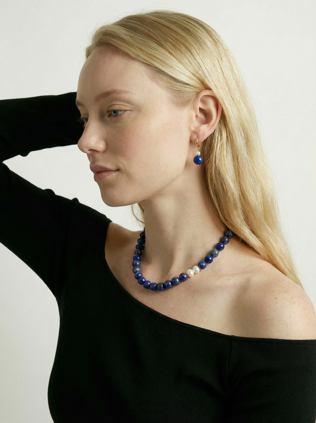上品なブルー ラピスラズリ ネックレス |K18ゴールド + シルバー925|天然石×淡水パール|北欧ミニマル
