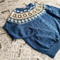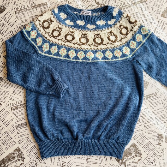 澄み渡る青空の下、森の木々に集うフクロウたちをイメージして編み上げた、世界に一点だけのオリジナルデザイン・セーターです。