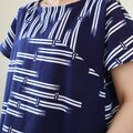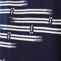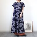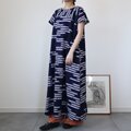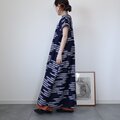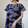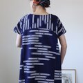 古い浴衣反物から作ったワンピースです。紺の地に白抜きのトンボ模様。前後の胸位置で生地を切り替えた裾広がりのシルエットです。裏地はありません。