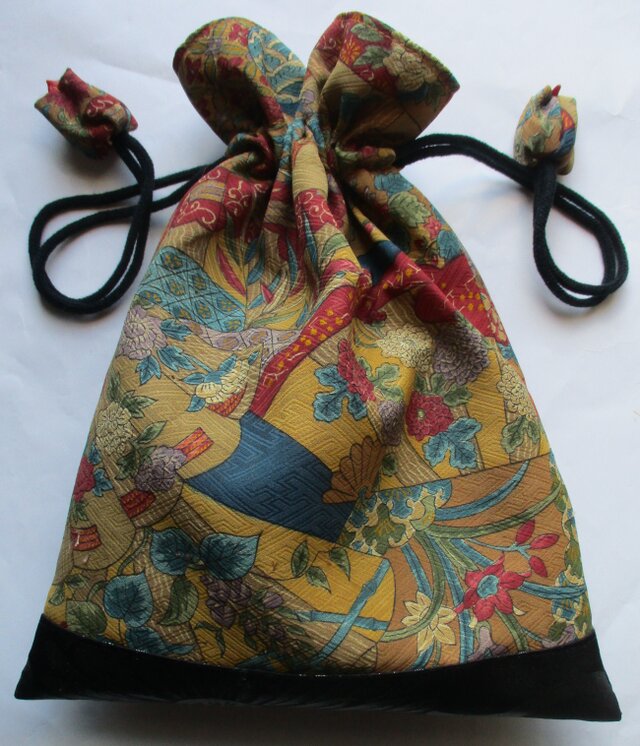 8629 花柄の着物で作った巾着袋