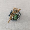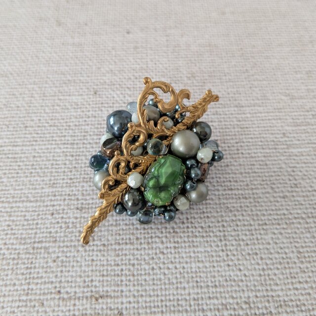 深みのあるグリーンのマウントトップ型ストーンを中心に、アールヌーヴォー調のパーツを組み合わせたアンティークテイストなブローチです。