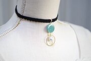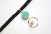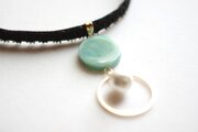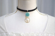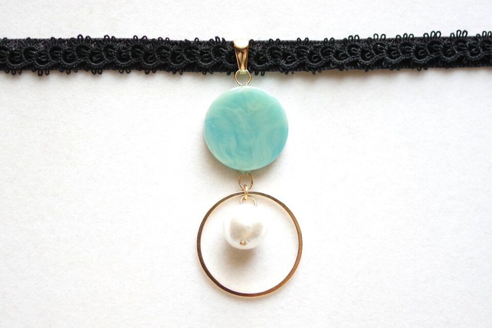 緑色のマーブル模様が美しく、コットンパールとリングが優雅さを添えているレジンを、ベルベットリボンにタティングレースで装飾を施したチョーカーに仕上げました。
