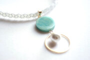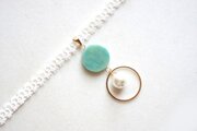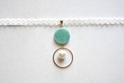 緑色のマーブル模様が美しく、コットンパールとリングが優雅さを添えているレジンを、サテンリボンにタティングレースで装飾を施したチョーカーに仕上げました。
