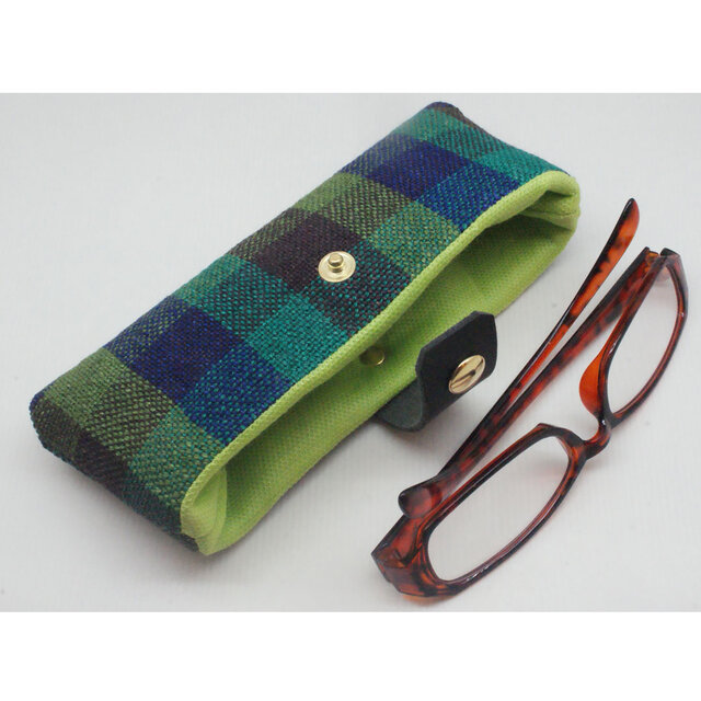 外寸約8×19cmのコンパクトサイズに、アイリッシュリネン糸を職人が手染めし、チェック生地を1点ずつ手織りで仕上げました。いつも持ち歩くメガネをスタイリッシュに収納でき、キズやホコリからしっかりガードします。